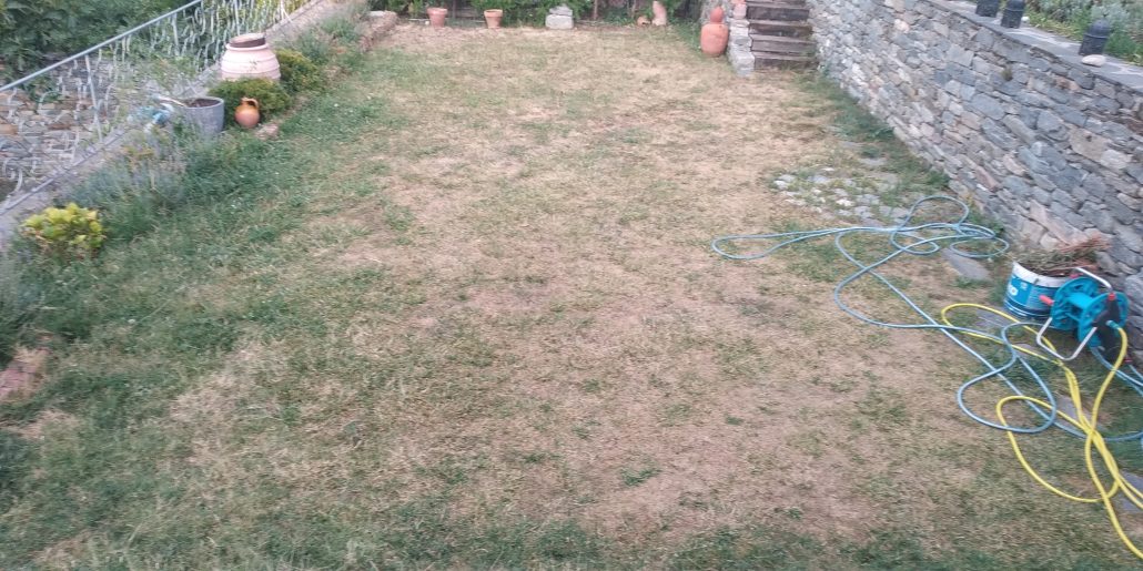 На фона на това безводие, всички усилия да поливаме отидоха напразно. Средата на месец юли вече бяхме толкова обезкуражени, че решихме да спрем да косим тревата и да поливаме.