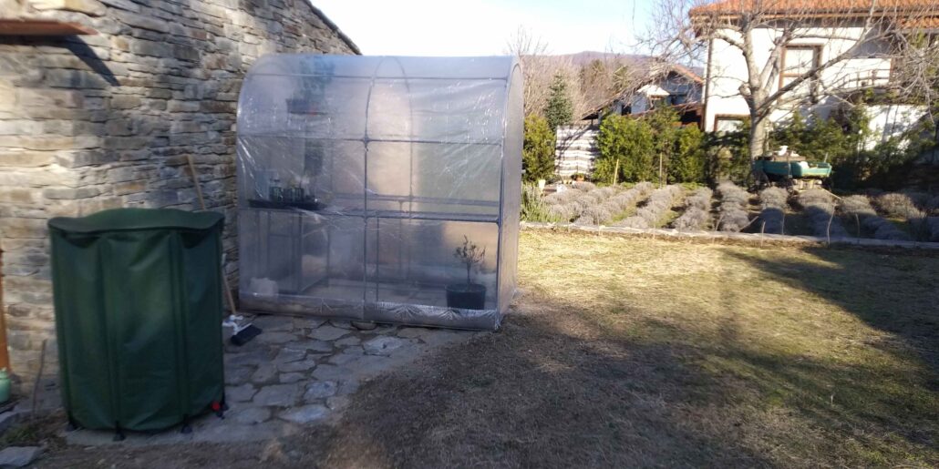 8 март 2026 – Инсталирахме малка оранжерия от Ikea и сглобяем варел за дъждовна вода, който поръчах от Emag, производство на полска фирма. За жалост, от както сложихме варела, не е капнала и капка дъжд.
